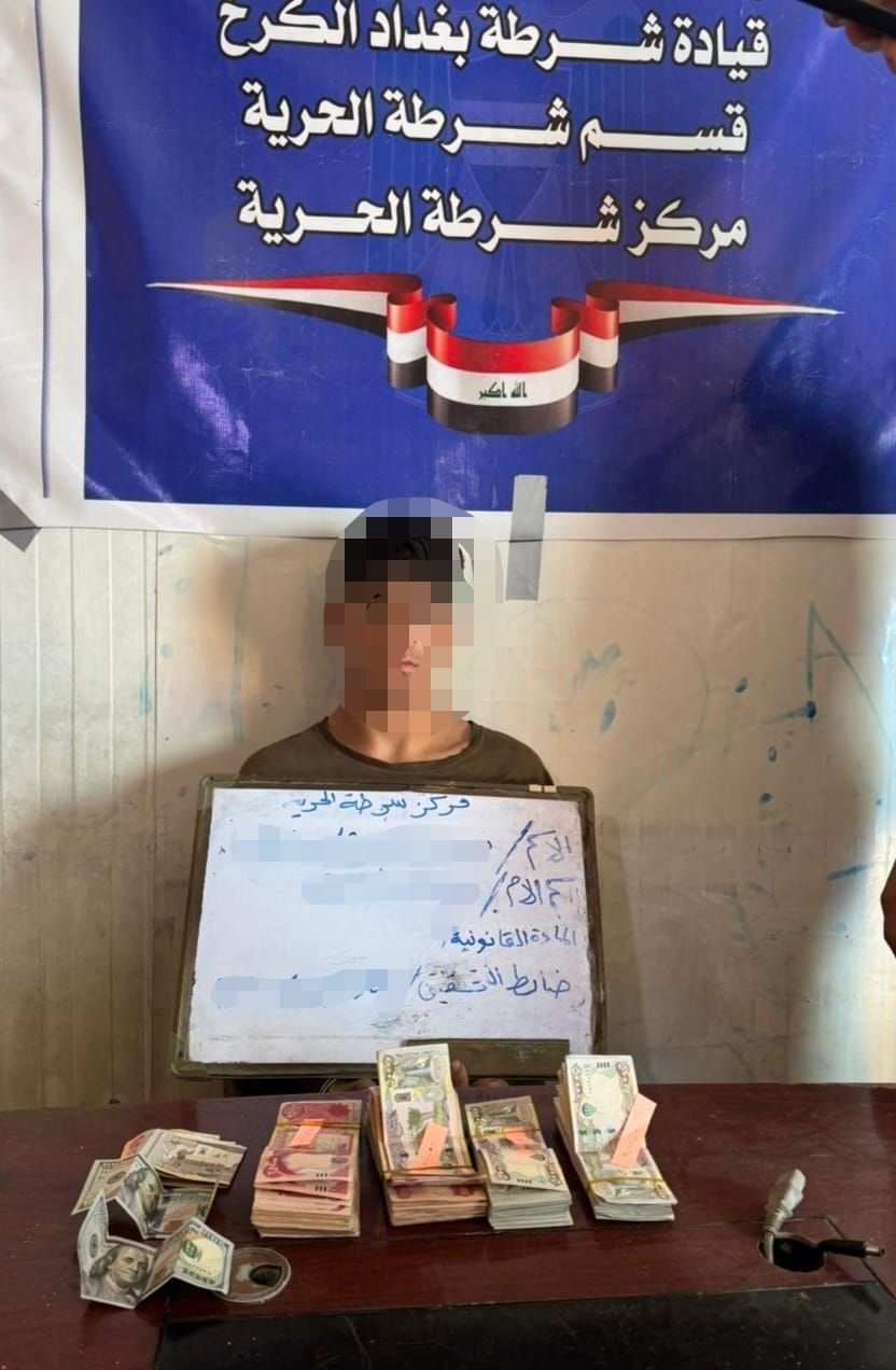 تمكنت مفارز قسم شرطة الحرية بالاشتراك مع مركز شرطة الحرية وقاطع نجدة الحرية، من إلقاء القبض على المتهم أثناء سرقته مبلغاً مالياً قدره (15) مليون دينار عراقي من منزل جدته في منطقة الحرية.