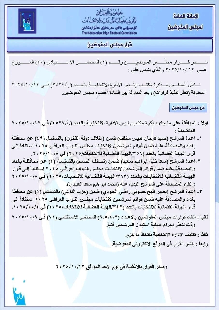 صادق مجلس المفوضين في المفوضية العليا المستقلة للانتخابات، اليوم الأحد (12 تشرين الأول 2025)، على إعادة ثلاثة مرشحين لانتخابات مجلس النواب العراقي 2025، فيما قرر إلغاء عدد من القرارات السابقة للمجلس.