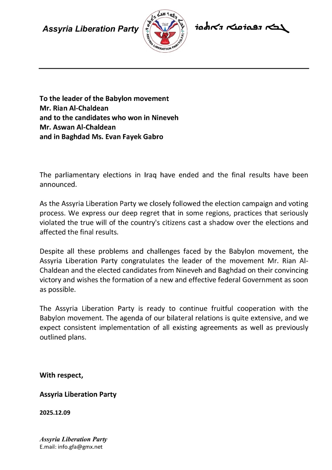 وعلى الرغم من هذه التحديات، قدّم حزب تحرير آشور تهانيه إلى قائد حركة بابليون، السيد ريان الكلداني، وإلى المرشحين الفائزين، السيد أسوان الكلداني عن محافظة نينوى، والسيدة إيفان فائق جابرو عن محافظة بغداد، بمناسبة فوزهم في الانتخابات البرلمانية.